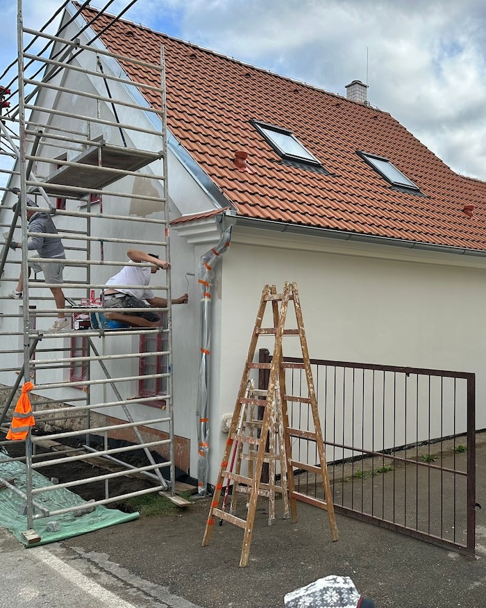 Dokončená komplexní renovace v Čekanicích u Blatné: výmalba interiéru, nátěr kovových prvků a nový nátěr fasády pro moderní vzhled a nový život domu.
